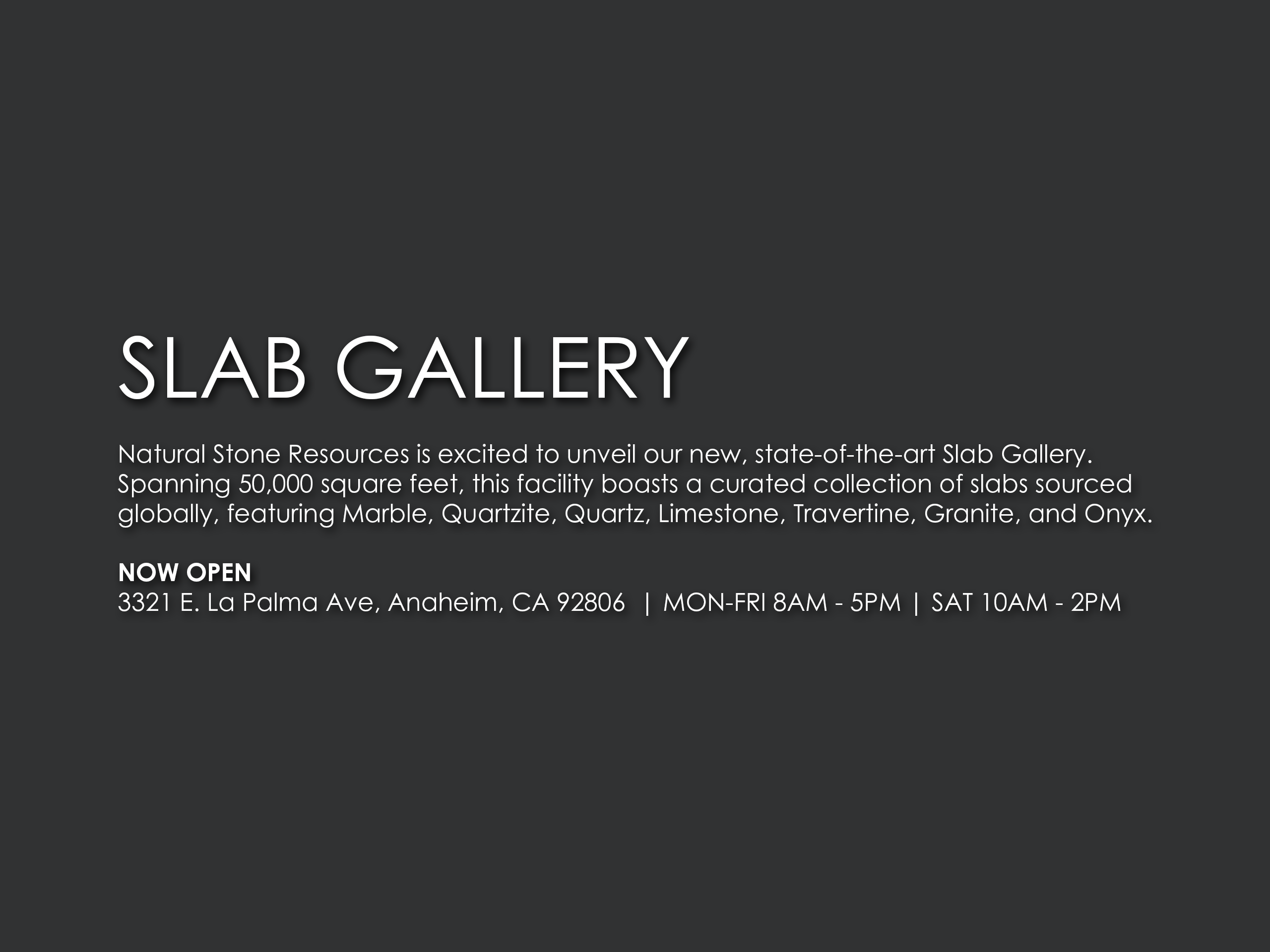 Natural Stone Resources is excited to unveil our new, state-of-the-art Slab Gallery. Spanning 50,000 square feet, this facility boasts a diverse collection of slabs sourced globally, featuring marble, quartzite, limestone, granite, onyx, and semi-precious stones.
